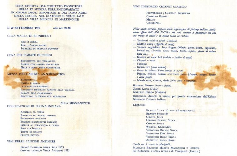 Si tratta dell’invito-menu, un foglio A4 piegato in due e stampato su tutte e quattro le facciate, alla “Cena offerta dal Comitato Promotore della IX Mostra dell’Antiquariato (di Firenze, ndr) in onore degli espositori e dei loro amici nella loggia, nel giardino e nelle sale della villa medicea di Marignolle” del 20 settembre 1975.