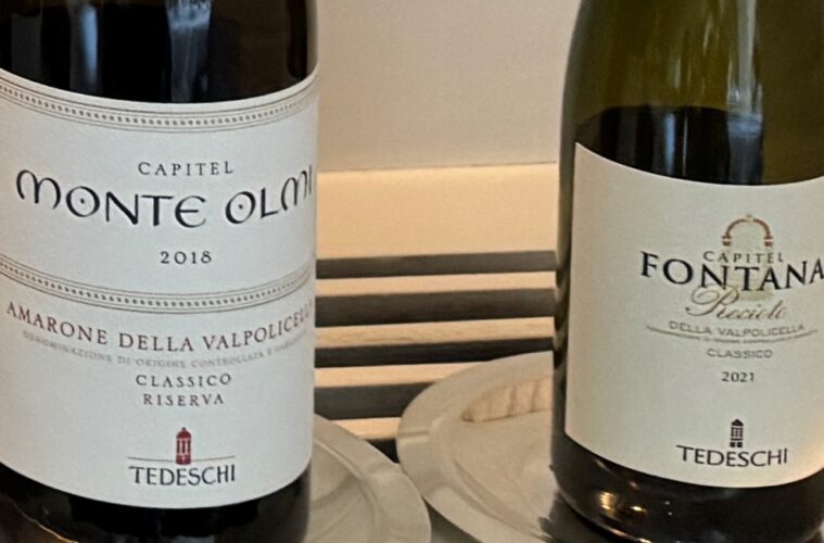 Le due dissertazioni, sempre per caso (o Caso?) hanno finito per convergere quando, per le recenti festività, a casa mi si è presentato un ulteriore amico, estraneo ai precedenti, con in mano un duplice omaggio: un Amarone della Valpolicella DOCG Classico Riserva Capitel Monte Olmi 2018 e un Recioto della Valpolicella DOCG Classico Capitel Fontana 2021, ambedue di Tedeschi, nome storico della Valpolicella.